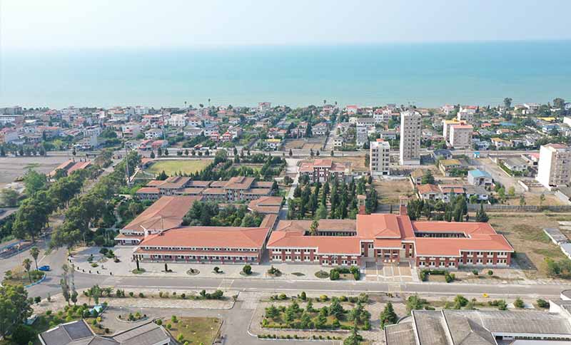 Expansive campus featuring a blend of modern and established architecture, multiple faculty buildings, advanced research laboratories, extensive library resources, student dormitories, comprehensive sports facilities, and a scenic location with proximity to the Caspian Sea.
