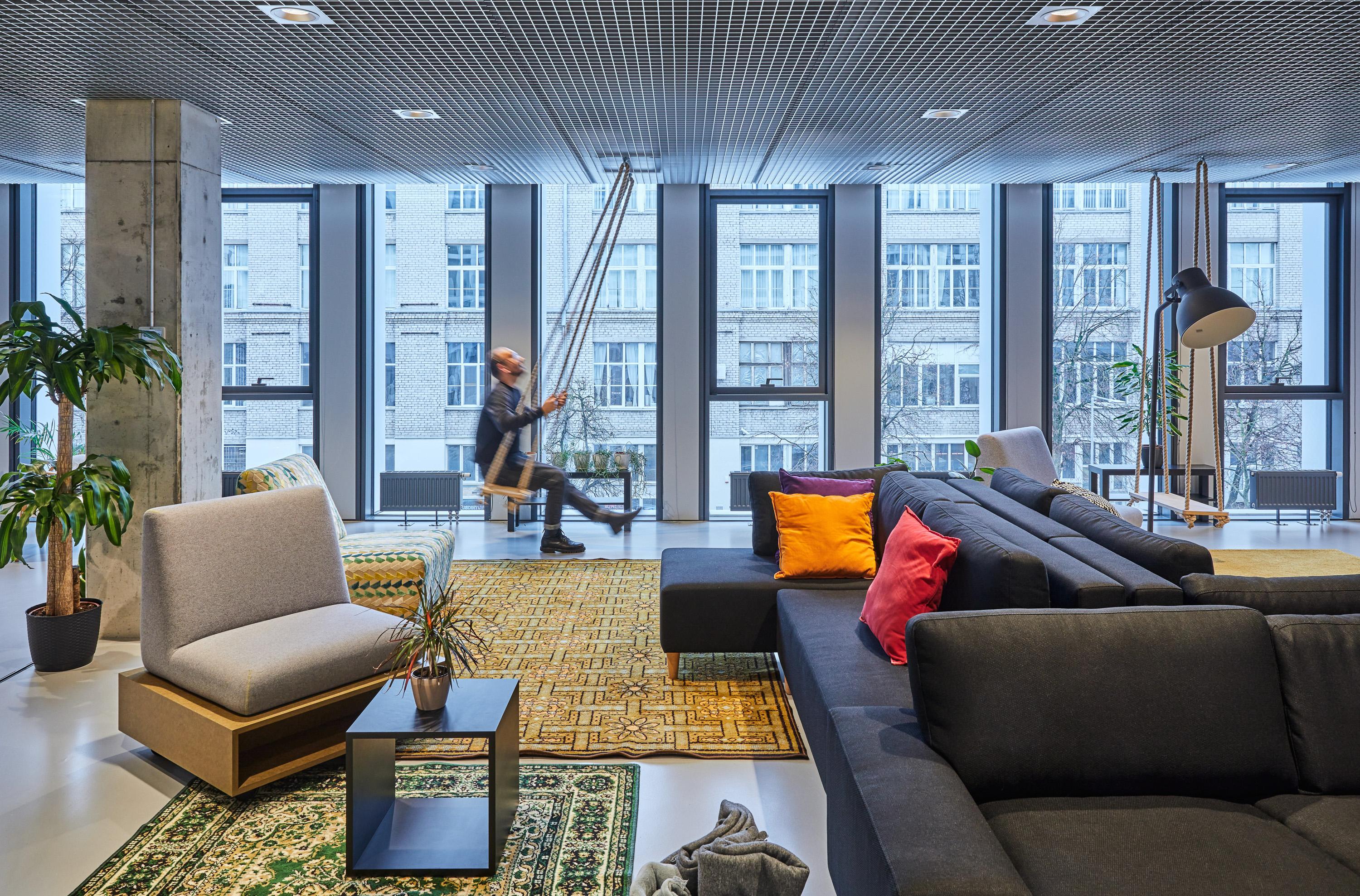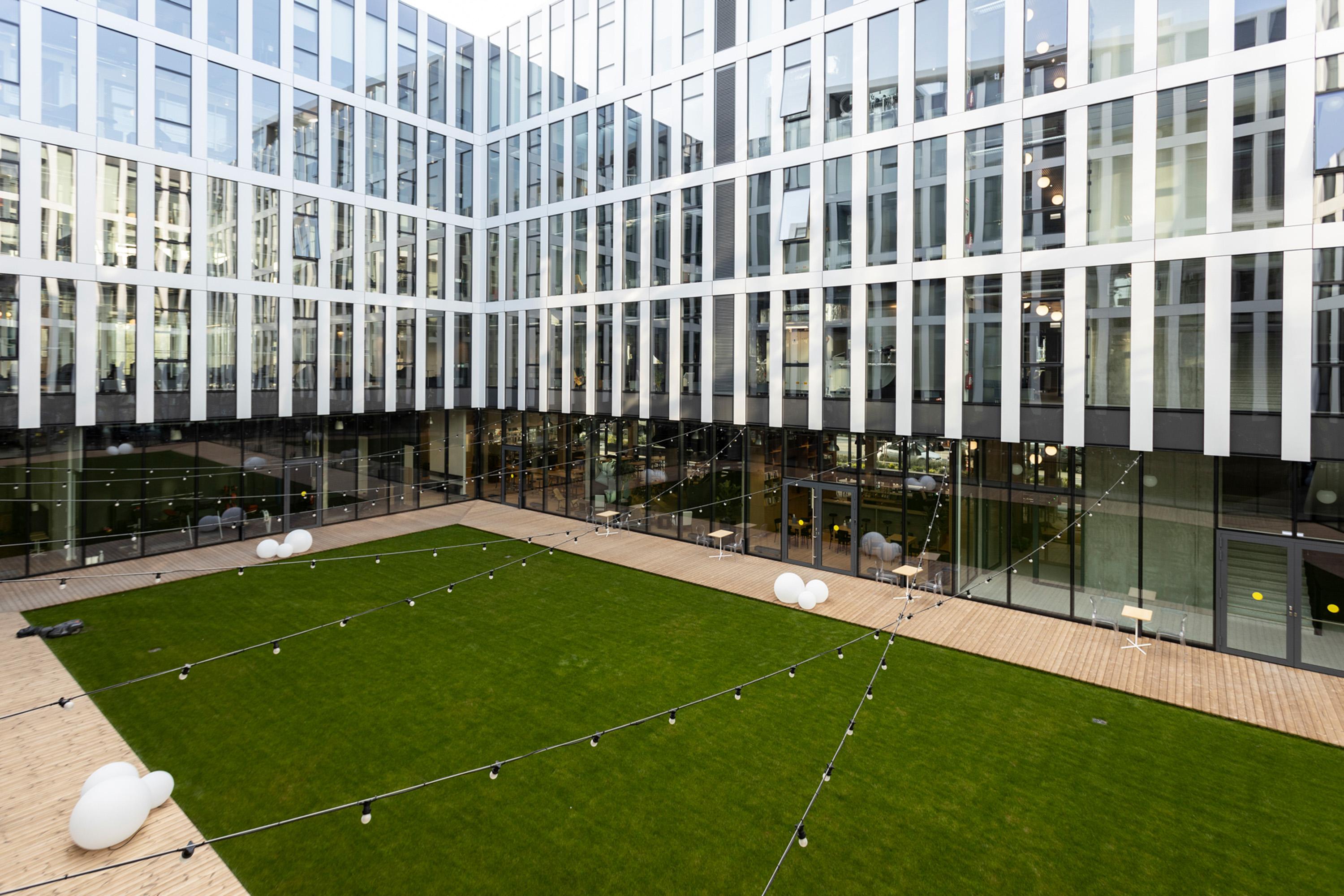 The new Vinted headquarters in the 'Uptown Park' business district is a modern, state-of-the-art facility designed with sustainability and collaboration in mind. It features open-plan workspaces, an internal courtyard, recreational areas, and can accommodate over 1,500 employees.