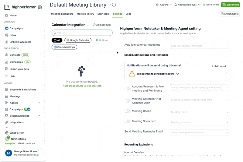 Auto-join rules, email notifications, pre-meeting research, recap recipients, scorecards, and recording exclusions are all configured once at the workspace level. Changes apply to all connected accounts equally.