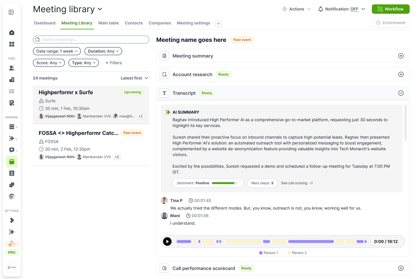 Once the meeting ends, Highperformr processes the recording and delivers these outputs to your Meeting Library: